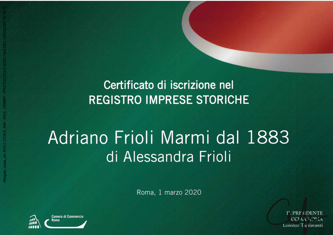 Il laboratorio di Adriano Frioli nasce nel solco dell'esperienza del suo fondatore, già membro dell'Università dei Marmorari di Roma e provincia (istituzione nata nel 1406). Frioli Adriano – Marmi dal 1883 prosegue in quel percorso antico fatto di tradizione e arte nella lavorazione della pietra. Il laboratorio ha, tuttavia, modernizzato le sue competenze, con tecniche di lavoro all'avanguardia. I due pantografi a controllo numerico sono diventati, quindi, fondamentali per dare forma a opere in marmo personalizzate e curate in ogni particolare. Lapidi e monumenti d'arte funeraria, targhe commemorative e stradali: visitate la sede di piazzale del Verano 70/71, a Roma .